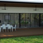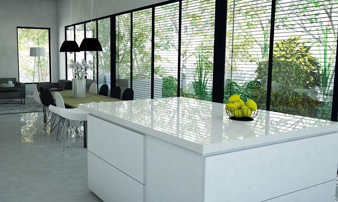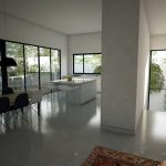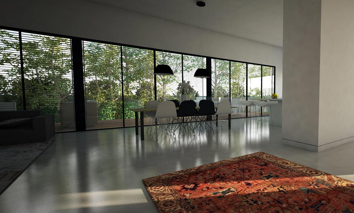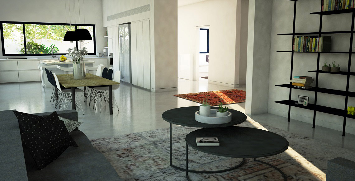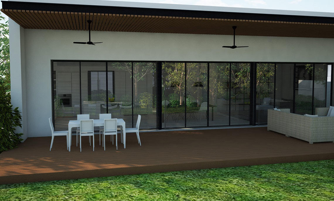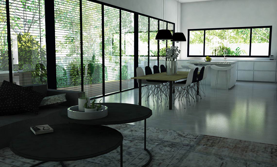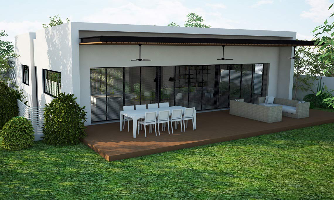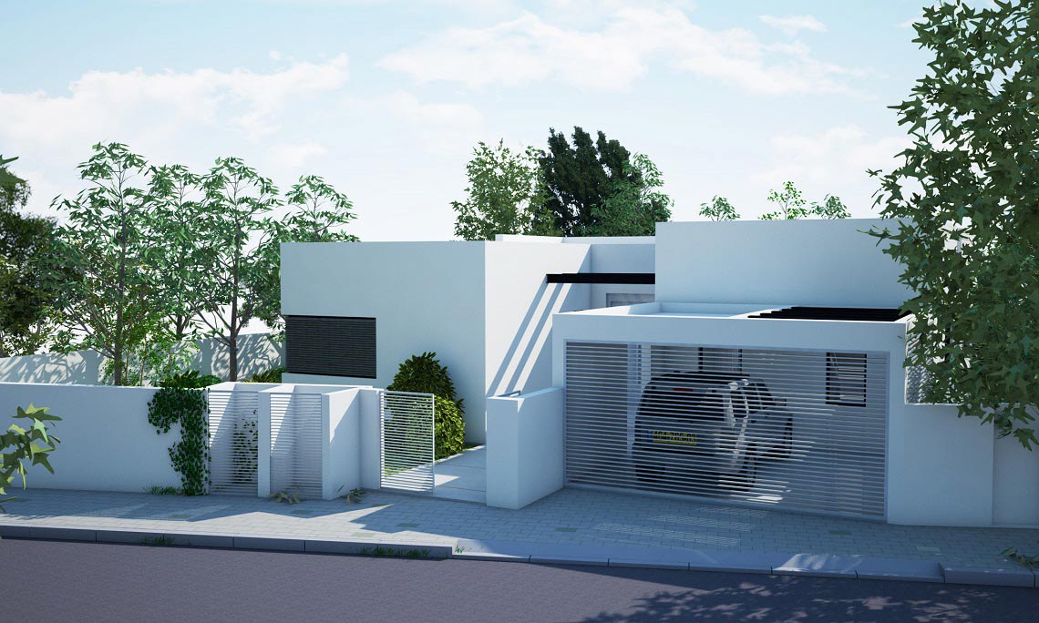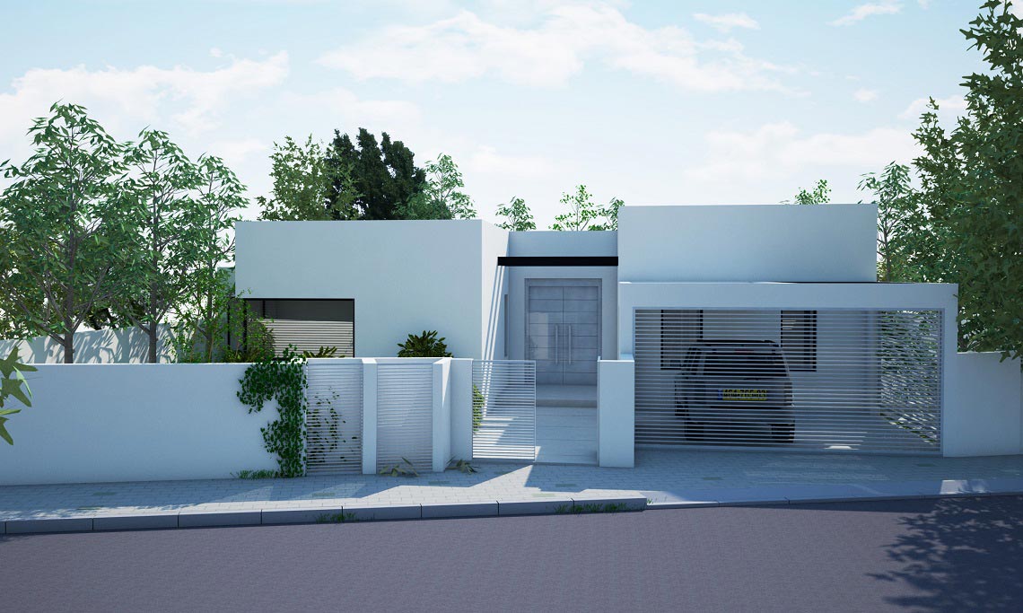 תכנון אדריכלי ועיצוב וילה – בית מגורים על קומת קרקע שתוכנן בצורת האות "H". תכנית העמדה והחלוקה מאוד ברורים, כאשר מחולק בתכנון הבית חולק ל-2 אזורים נפרדים ע"י מבואת כניסה רחבה. אזור המגורים לחדרי השינה ואזור משני לחללים הציבוריים הפונים בוויטרינה רחבה להמשך חצר הגינה.