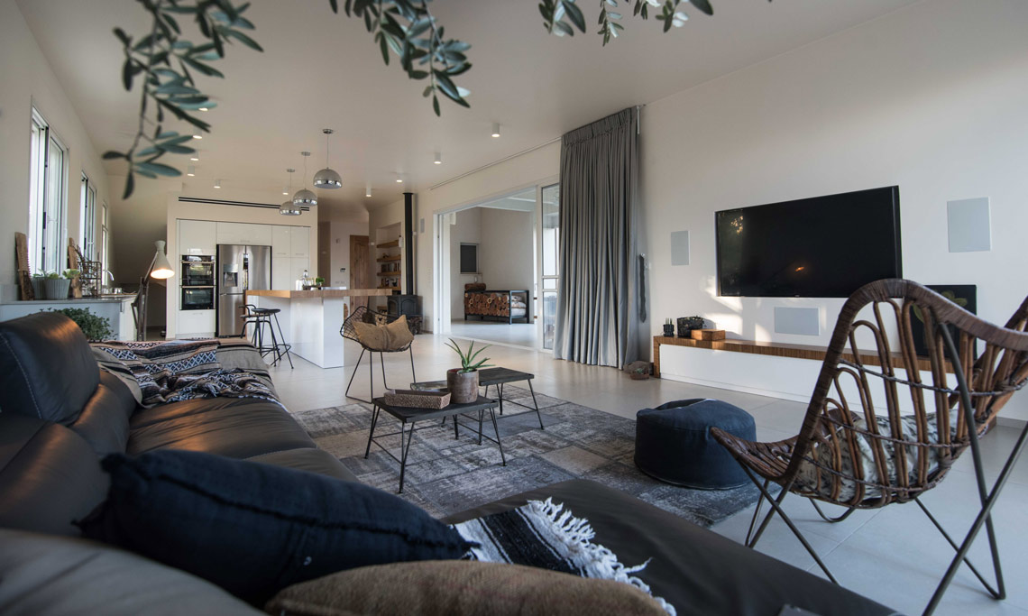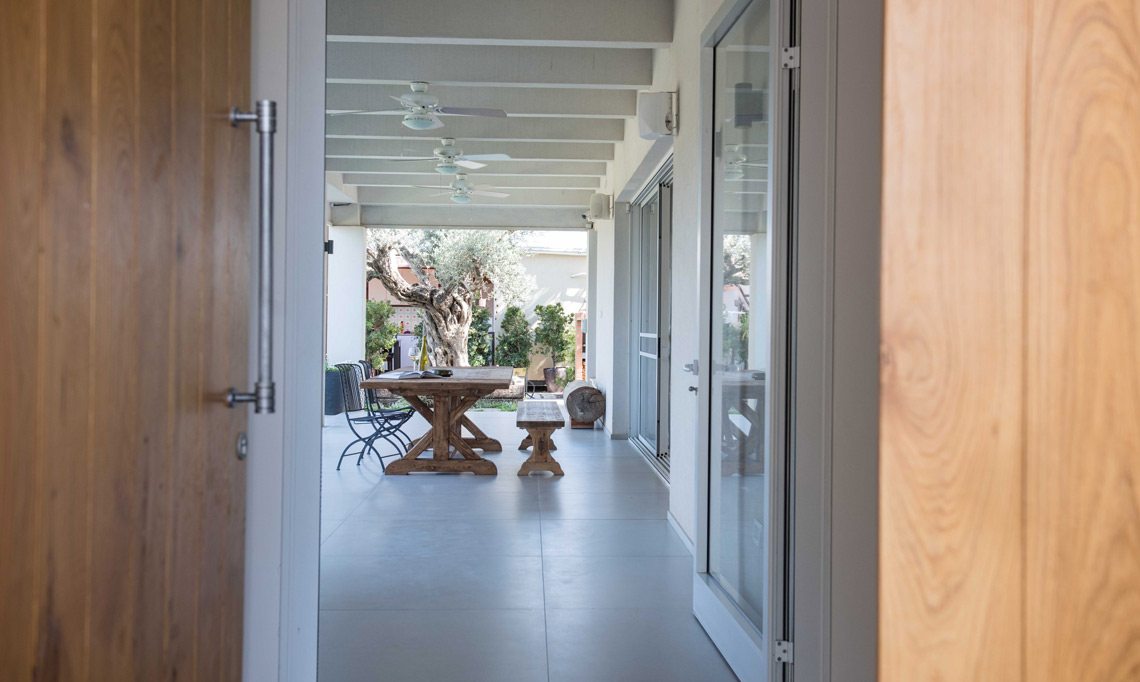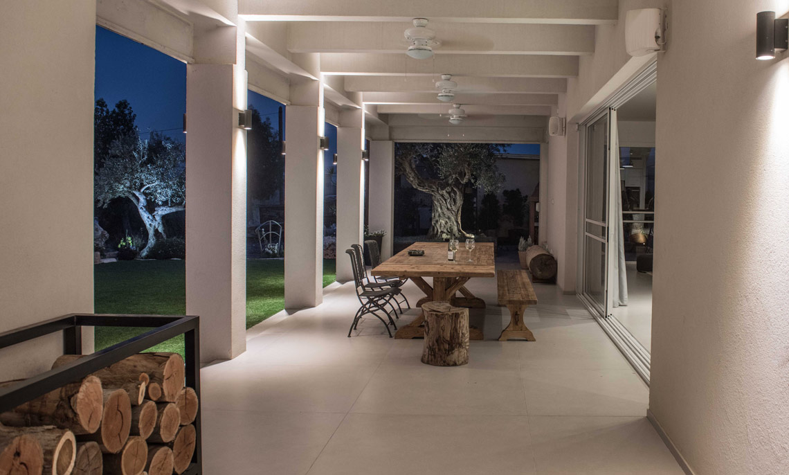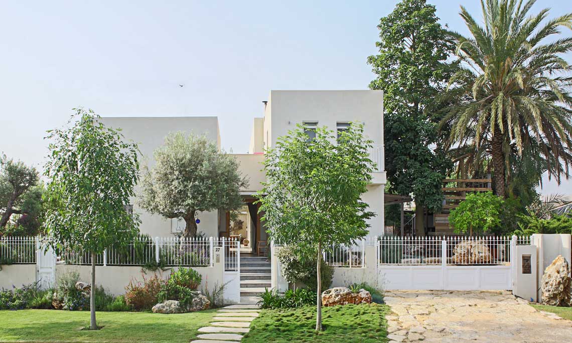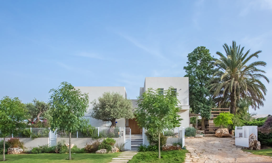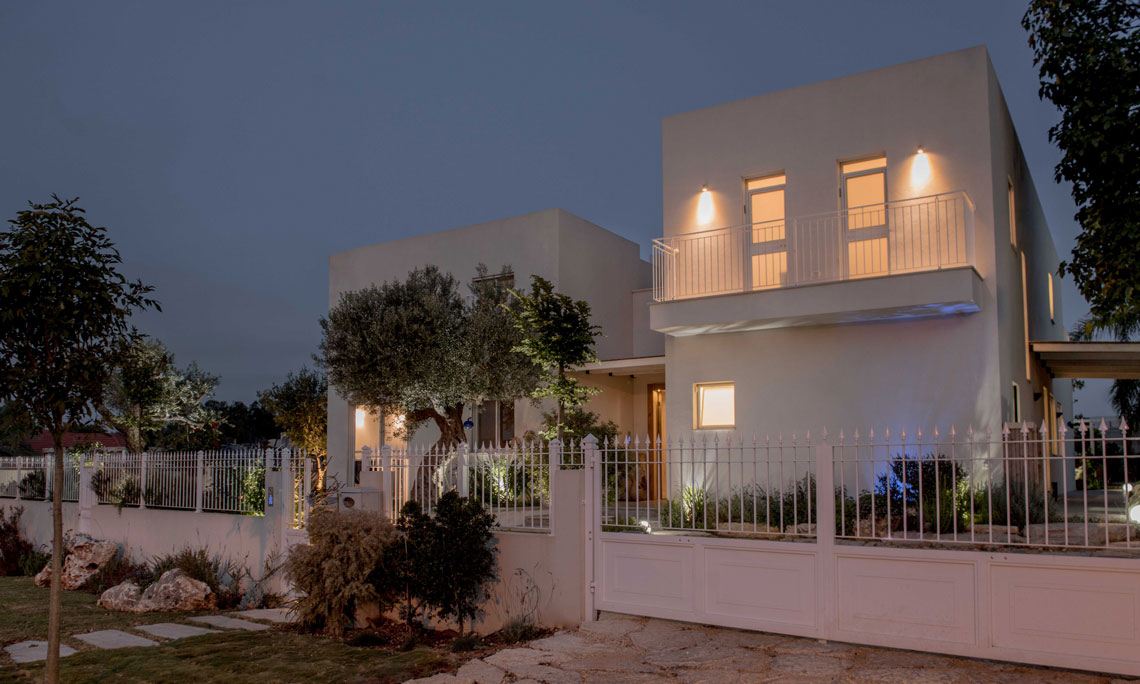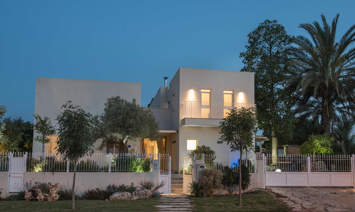 תכניות אדריכלות ועיצוב פנים לוילה במושב בשרון. תכנון אדריכלי של העמדת המבנה במגרש בצורת האות "L", מאפשר זווית ראיה מכל פינה בבית לכיוון חצר הבית והגינה וחדירת אור טבעי לחללים השונים. ריבוי בשימוש גוונים חמים בהלבשת הבית ליצירת שקט והרמוניה שהתקבלו מפרטי העיצוב המשלימים בבית.